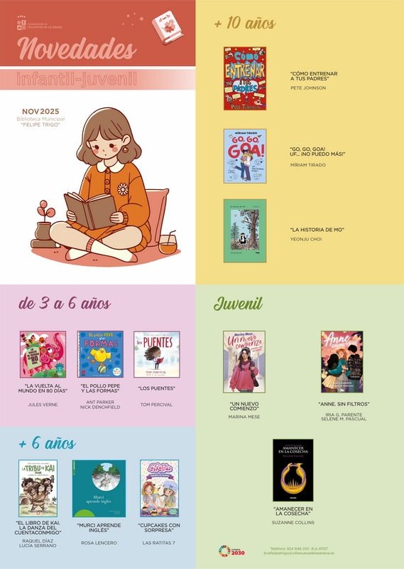 En las novedades dirigidas a niños y niñas de más de 6 años están “El libro de Kai”de Raquel Díaz y Lucía Serrano, “Murci aprende inglés” de Rosa Lencero, y el volumen 7 de “Las ratitas”. De más de 10 años los libros son “Cómo entrenar a tus padres” de Pete Johnson, “Go, go, go, nio puedo más” Miriam Tirado y “La historia de Mo” de Yeonju Choi. Por último las novedades de literatura juvenil son “Un nuevo comienzo” de Marisa Mese, “Anne. Sin filtros” de Iria G. Parente y Selene M. Pascual, y la última entrega de Los juegos del Hambre titulado “Amanecer en la cosecha” de Suzanne Collins.