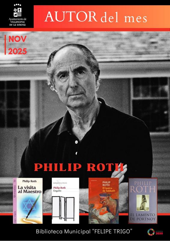 Como es habitual, comienza noviembre y la biblioteca municipal Felipe Trigo presenta las novedades correspondientes al nuevo mes. En esta ocasión el autor del mes es el estadonidense de origen judío Philip Roth, novelista imprescindible del siglo XX, y del que hay disponible cuatro obras en la biblioteca: “La visita al maestro”, “Engaño”, “El teatro de Sabbath” y “El lamento de Portnoy”.